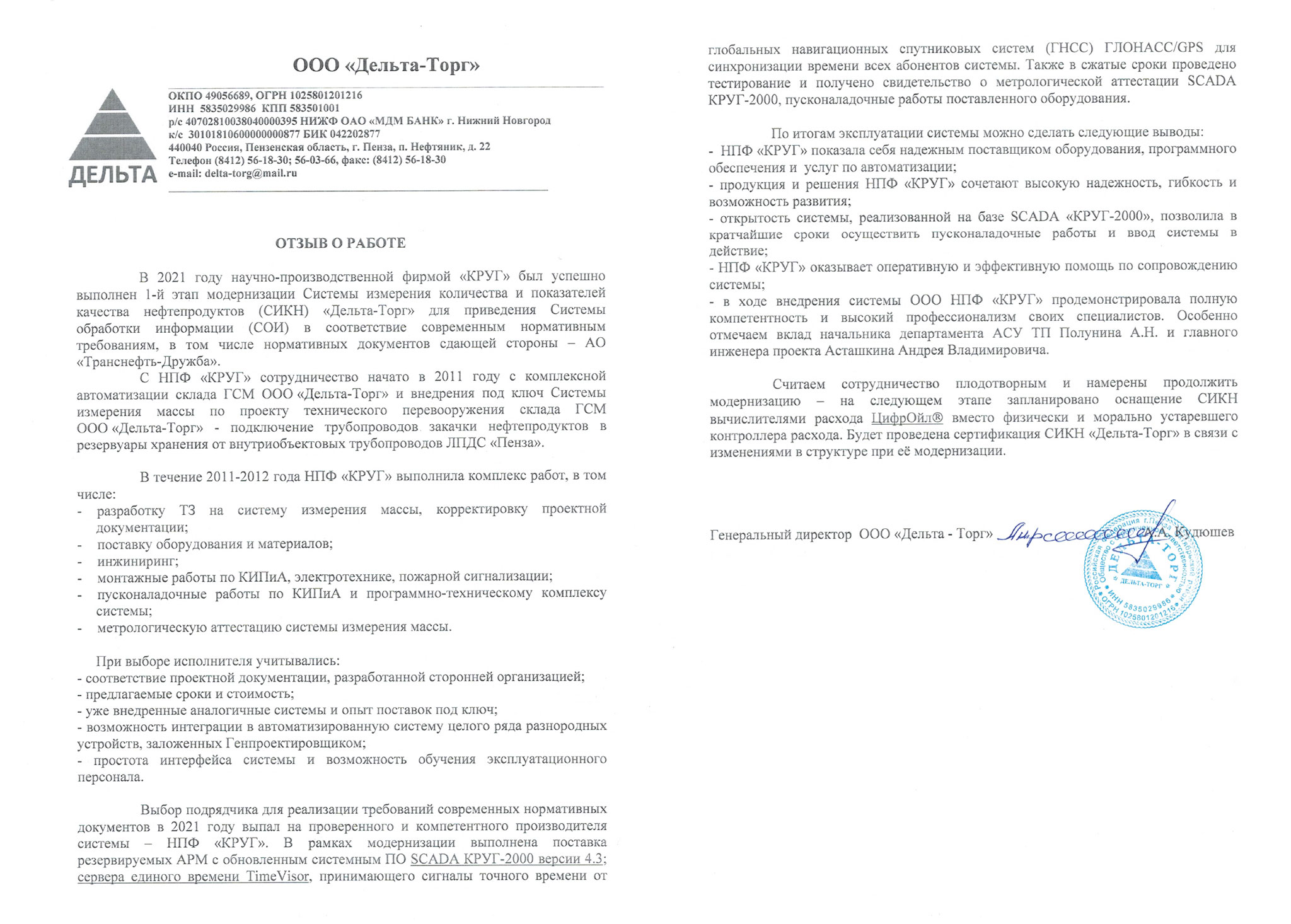 Отзыв о работе системы измерения количества и показателей качества нефтепродуктов (СИКН)