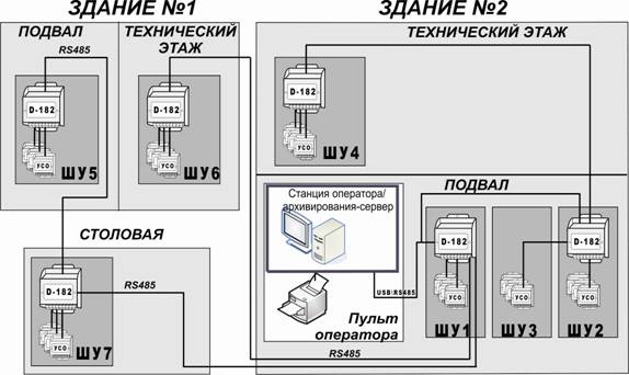 Станции диспетчерского управления обмениваются информацией с сервером БД (клиент-серверная архитектура), который в особо ответственных случаях может быть зарезервирован. Сервер БД, в свою очередь, выполняет функции сбора информации с устройств (контроллеров), осуществляющих работу подсистем жизнеобеспечения зданий, производит архивирование информации и расчётные задачи.