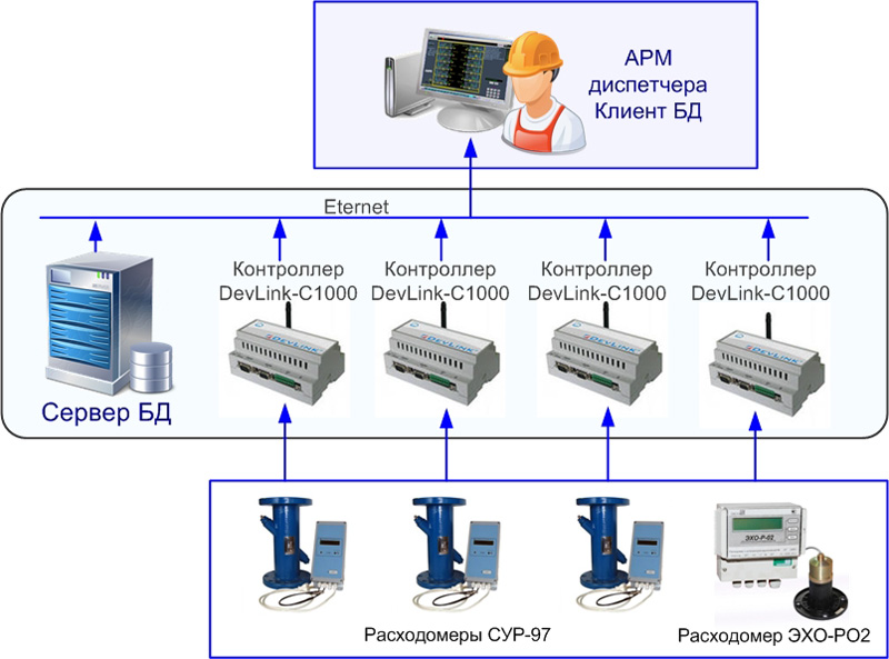 Все ультразвуковые расходомеры объединены цифровой сетью RS-485 и опрашиваются контроллерами по протоколу MODBUS. Также в контроллерах Devlink-C1000 ведётся расчёт потребления воды на различных интервалах времени и выполняется хранение архивной информации.