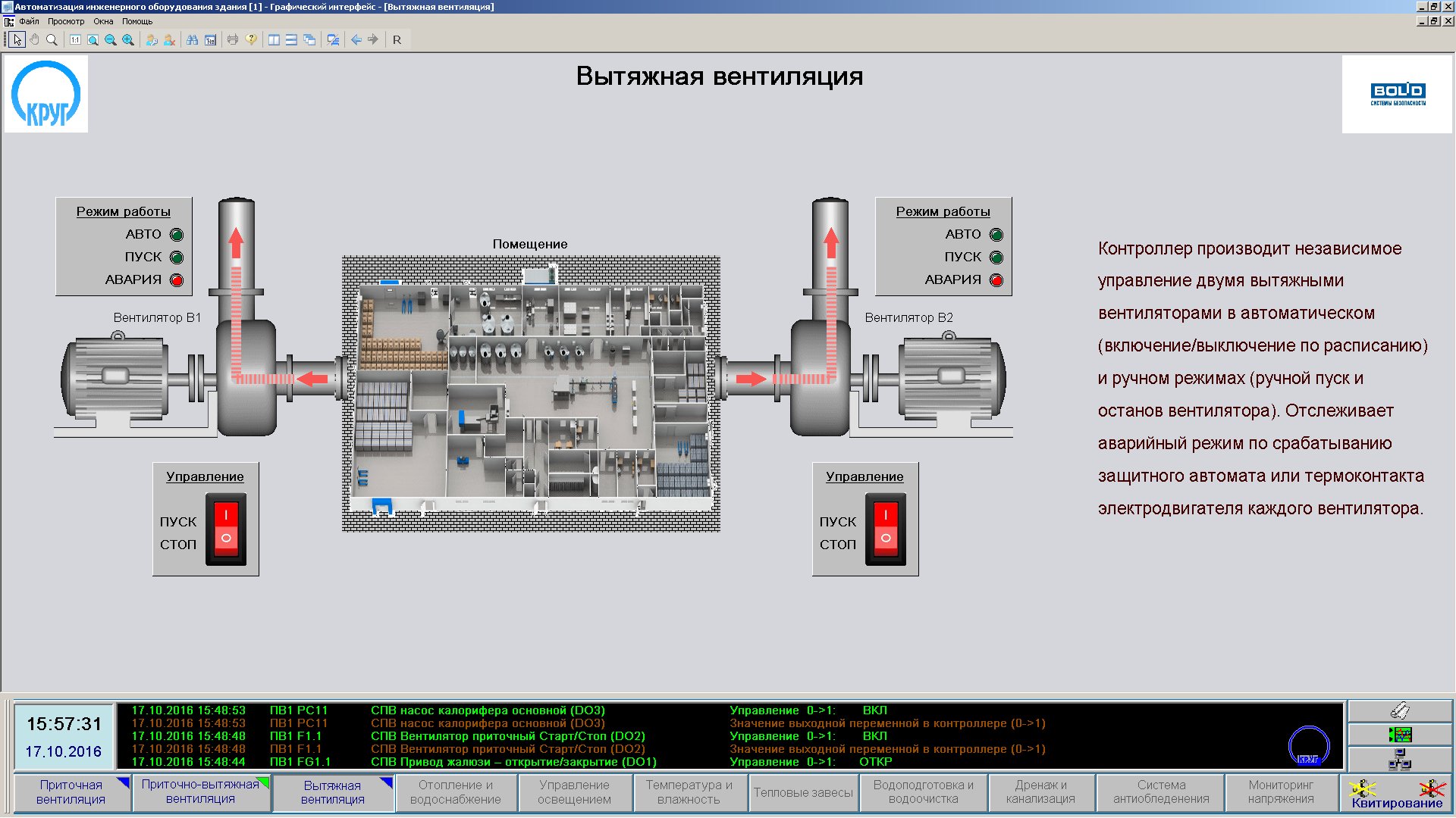 - Управление вентиляционными установками (автоматическое и ручное дистанционное)