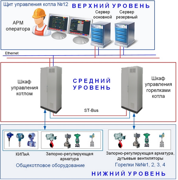 Во 2-й (средний) уровень входят шкаф управления общекотловым оборудованием и шкаф управления горелками котла на базе микропроцессорных контроллеров. На данном этапе развития системы полностью заменено физически и морально устаревшее контроллерное оборудование на современное с увеличением количества модулей ввода-вывода.