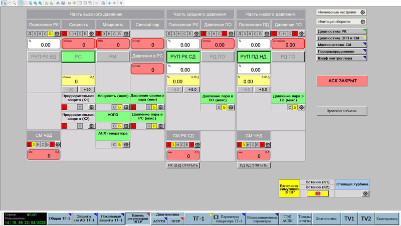 Непосредственно в процессорных модулях контроллера осуществляется ведение быстрых архивных лент для фиксации изменения рабочих параметров турбины с течением времени.