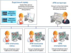 - АРМ обучаемого (оператора, нач. смены и т.д.), на котором устанавливаются графические интерфейсы с управлением, серверы базы данных и дополнительное вспомогательное ПО.