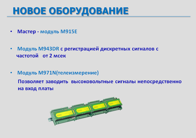 Мастер модуль M915E имеет расширенный набор интерфейсов и предназначен для решения задач автоматизации среднего и высокого уровней сложности. Плата M943DR дает возможность регистрировать дискретные сигналы с частотой от 2 мсек. Плата M971N позволяет заводить высоковольтные сигналы непосредственно на вход платы.
