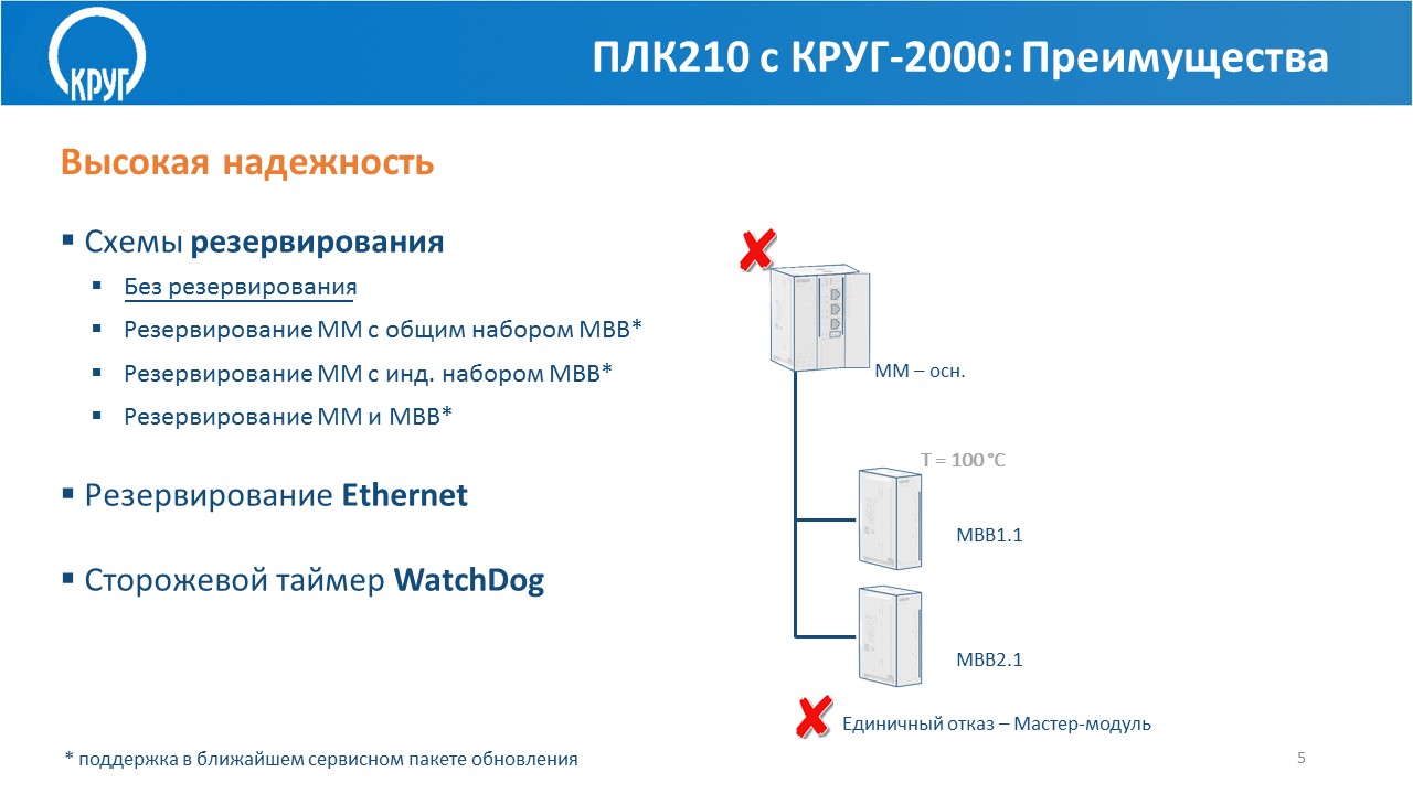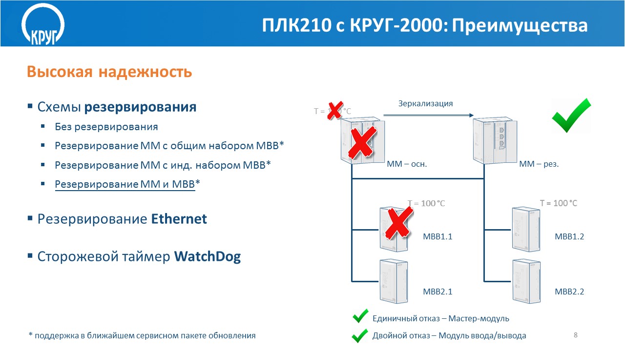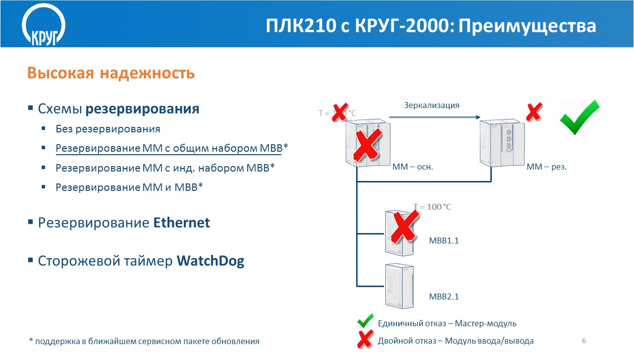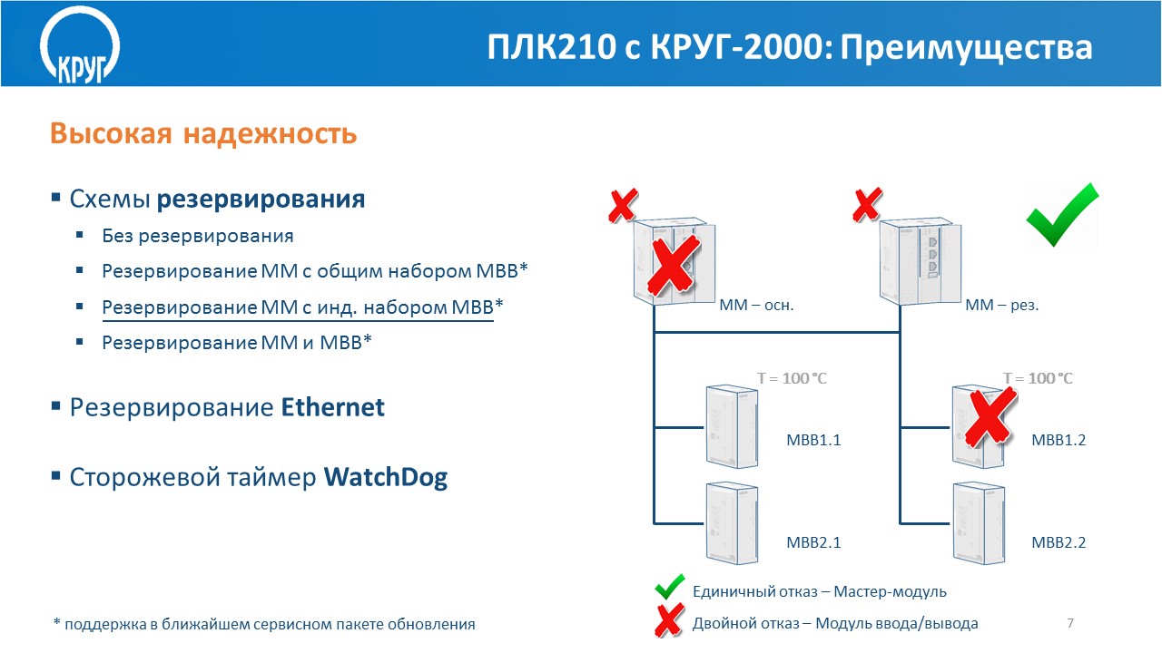 - поддерживает различные схемы аппаратного резервирования: 100%-ое «горячее» резервирование контроллера, 100%-ое «горячее» резервирование процессорного модуля (более подробно о резервировании ПЛК210 см. в презентации ниже)