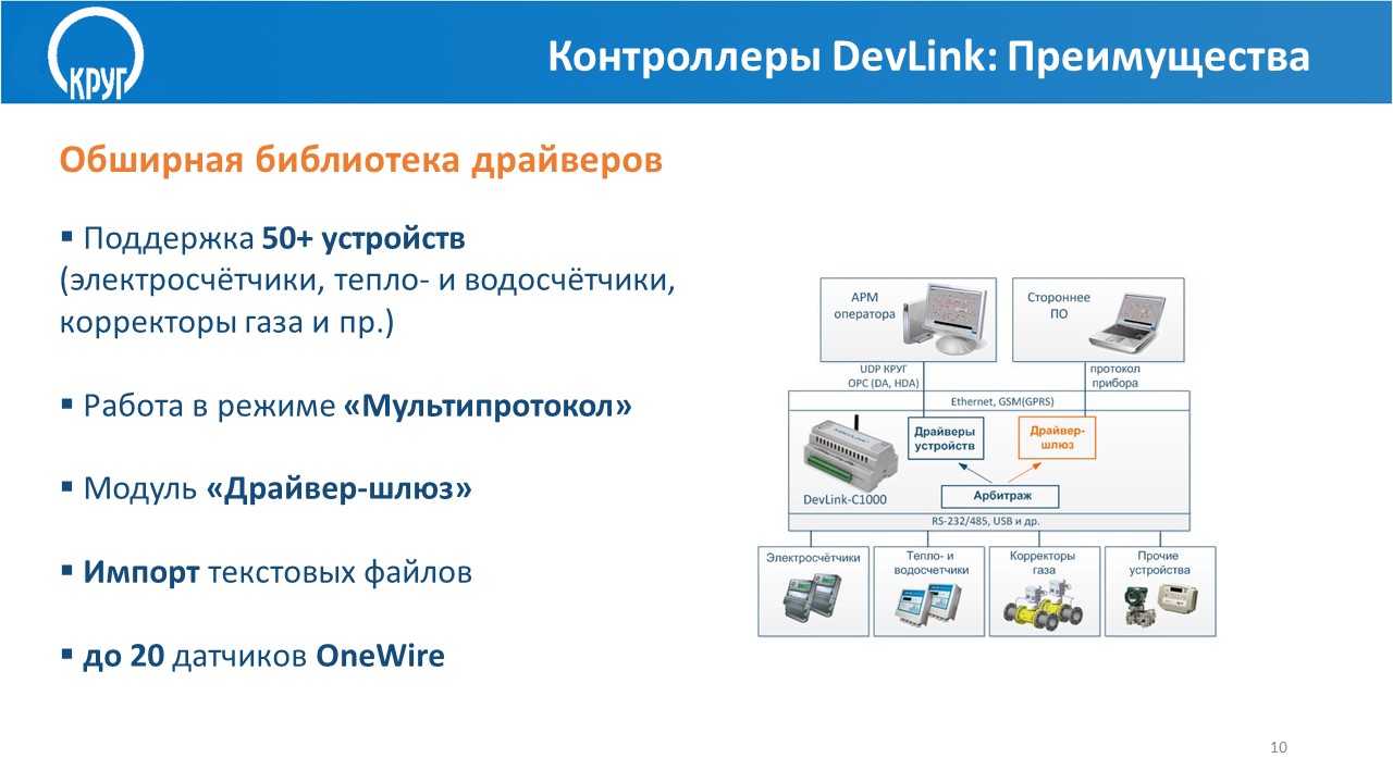 В сочетании с модулями ввода-вывода DevLink-A10 контроллер DevLink-C1000 способен опрашивать различные датчики и приборы (термопары, термосопротивления, приборы с унифицированным токовым выходом и т.д.) и формировать управляющие воздействия. ПЛК способен опрашивать множество различных приборов и считывать архивы.