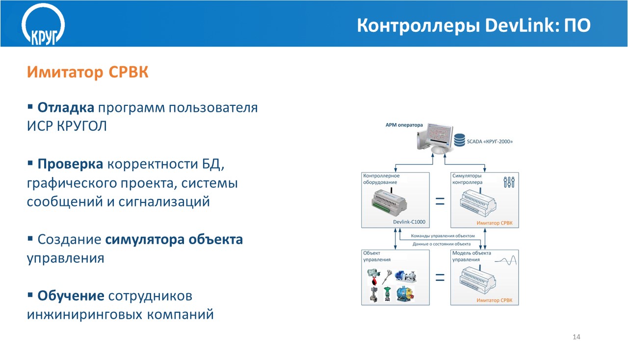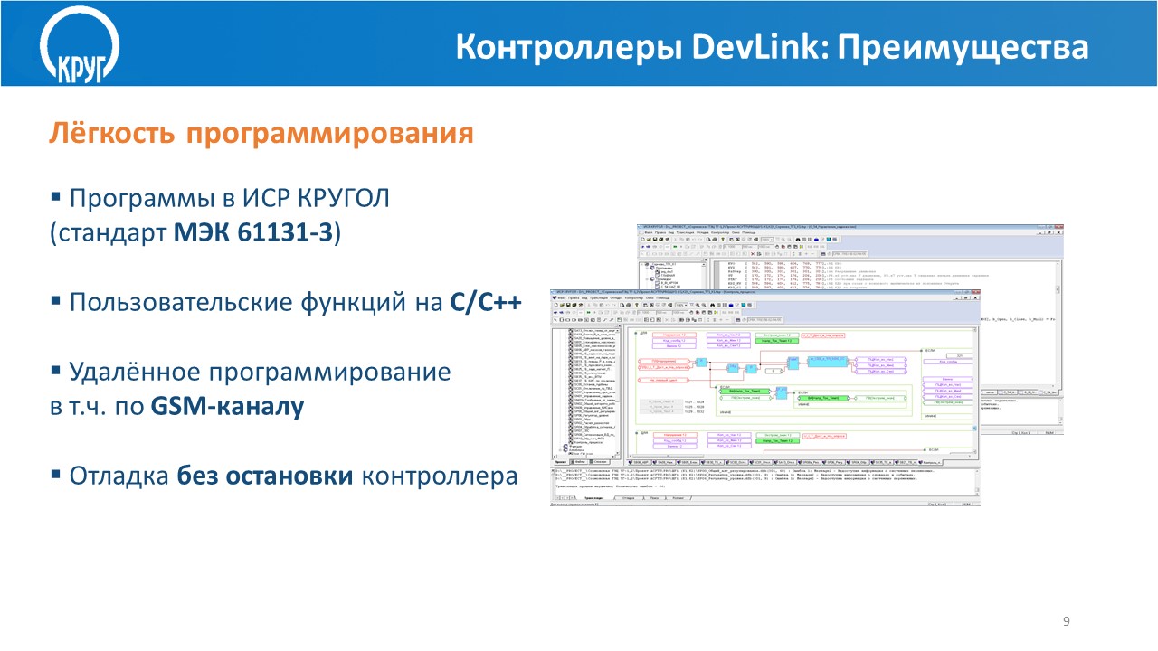- Выполнение алгоритмов пользователя, разработанных на языке КРУГОЛ™ (разработка пользовательских алгоритмов осуществляется в интегрированной среде разработки (ИСР) КРУГОЛ™ на языке стандарта МЭК 61131-3).